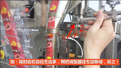 1)包裝膜安裝好后,開機測試,包裝膜制袋后,出現(xiàn)如下圖包裝袋背面封口左邊袋子邊比右邊袋子邊短小的情況。接下來根據(jù)包裝膜拉膜跑偏的情況調(diào)節(jié)包裝機的成型器。